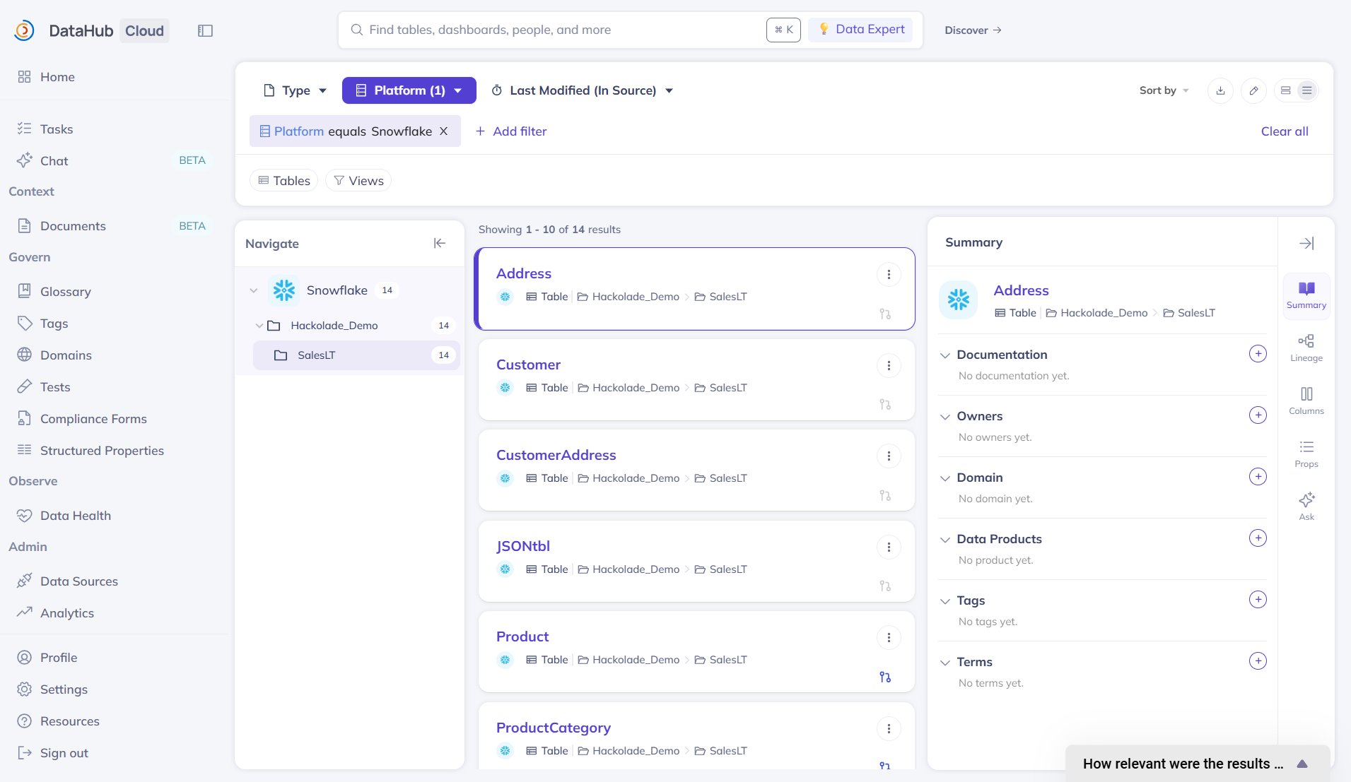 DataHub is an open-source, governance metadata management platform that provides a comprehensive solution for data discovery, data lineage, and data governance. It helps organizations catalog and organize their data assets, allowing teams to easily find, understand, and trust the data they are working with.